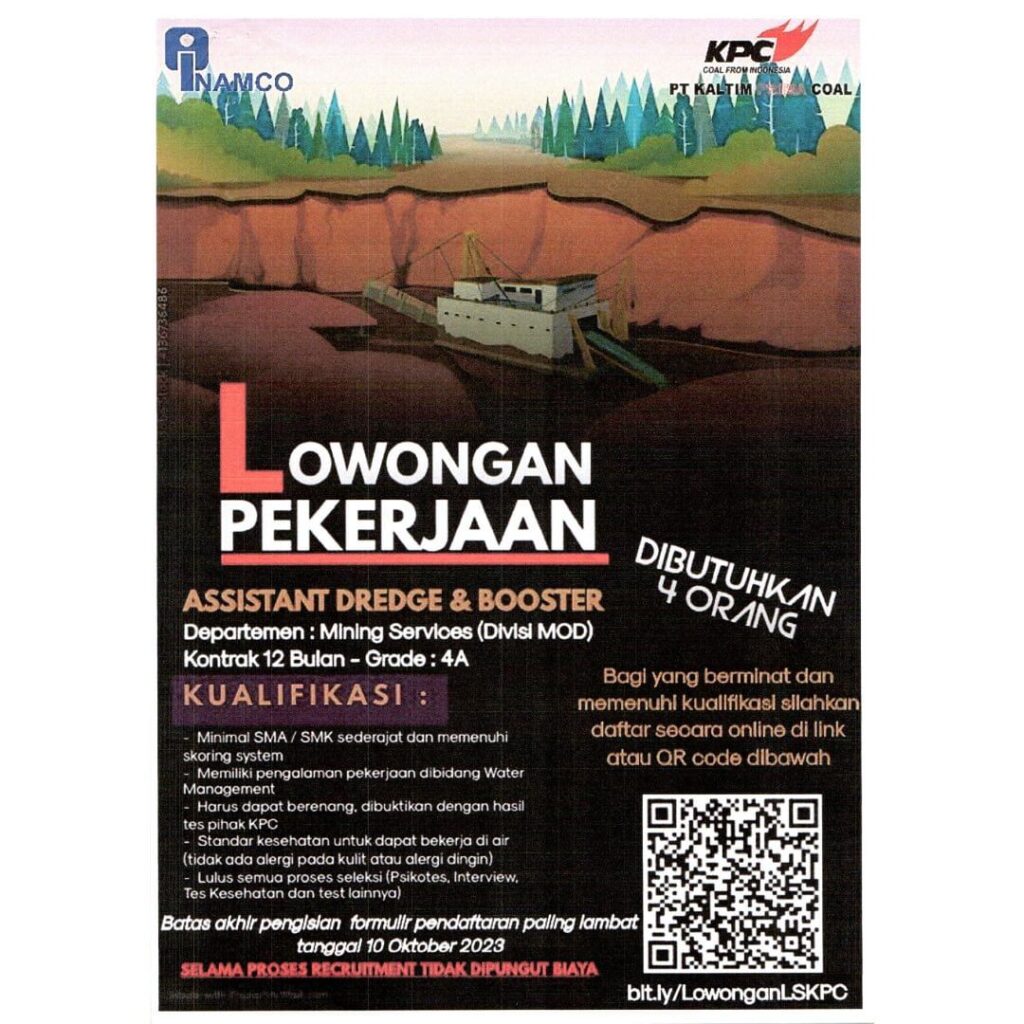 KUTIM – PT Inamco membuka sejumlah lowongan kerja (loker) penempatan PT Kaltim Priam Coal (KPC). Lowongan pekerjaan dibuka hingga 11 Oktober 2023.
